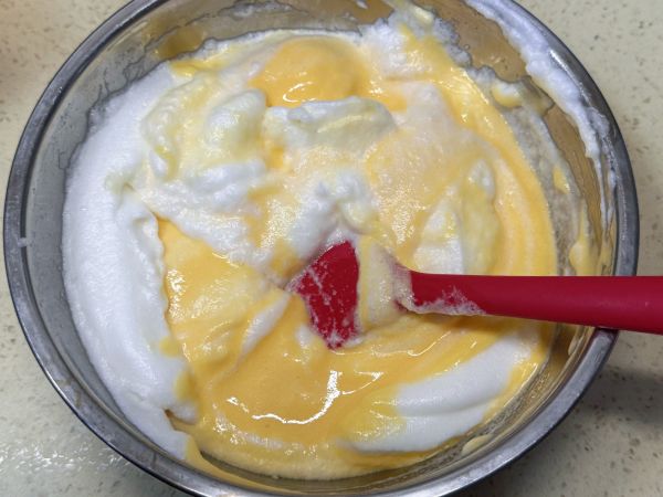 另取一个容器打发蛋白霜,将4只蛋白加八细砂糖打发至小弯勾,湿性发泡,不要打到收挺直角的硬性,这样蛋糕卷会卷不起开