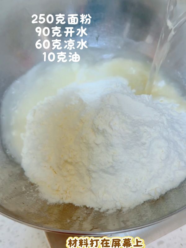 250g普通中筋面粉 :一半用90g开水烫面;一半用60g冷水,10克油,和面
