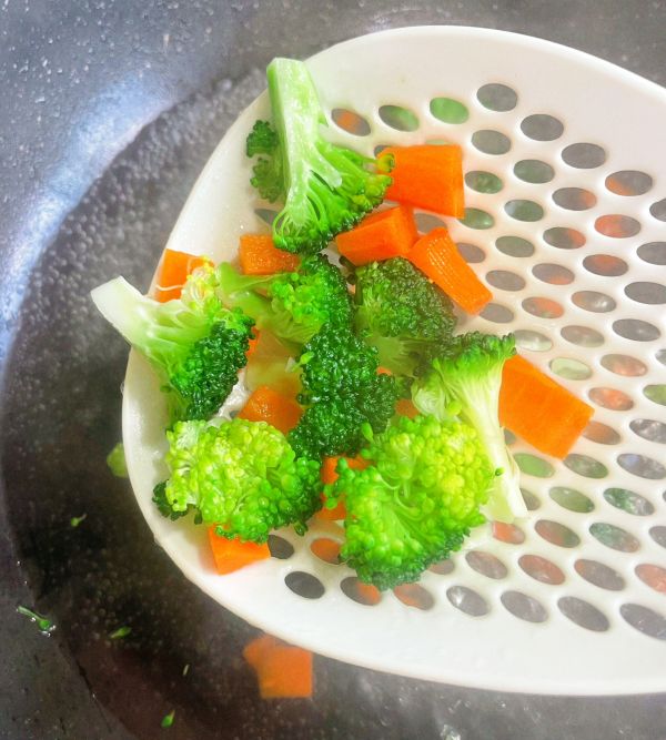 倒入过凉水的西兰花和胡萝卜粒,翻炒几下。
