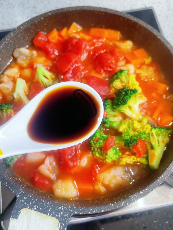 准备材料:红梅黄酒料酒、鳕鱼切丁、番茄丁罐头(番茄味更浓,没有番茄罐头,就用生番茄加番茄酱也可以),胡萝卜切丁、西兰花切小朵备用。