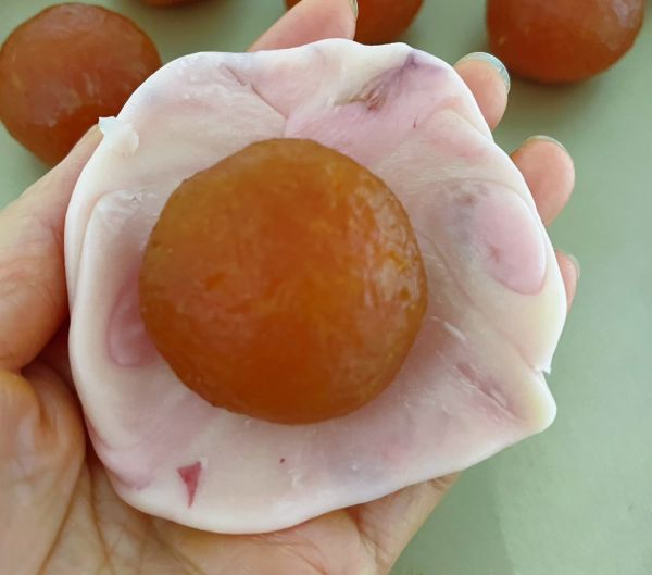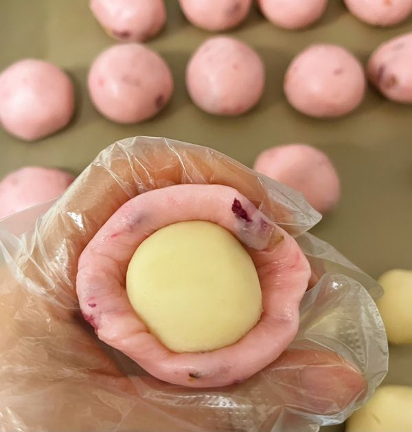 油皮材料混合揉匀,用保鲜膜包好,冷藏1小时以上。 酥皮材料混合均匀后,用保鲜膜包好,冷藏备用。 冷藏好后,一个油皮包入一份油酥。