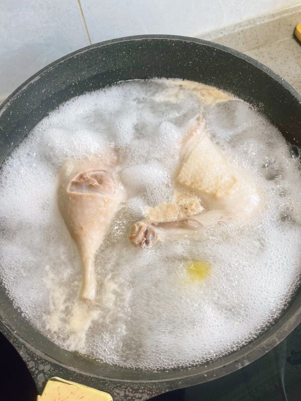 锅中加入适量清水、鸭肉、姜片、红梅黄酒料酒去腥增鲜。