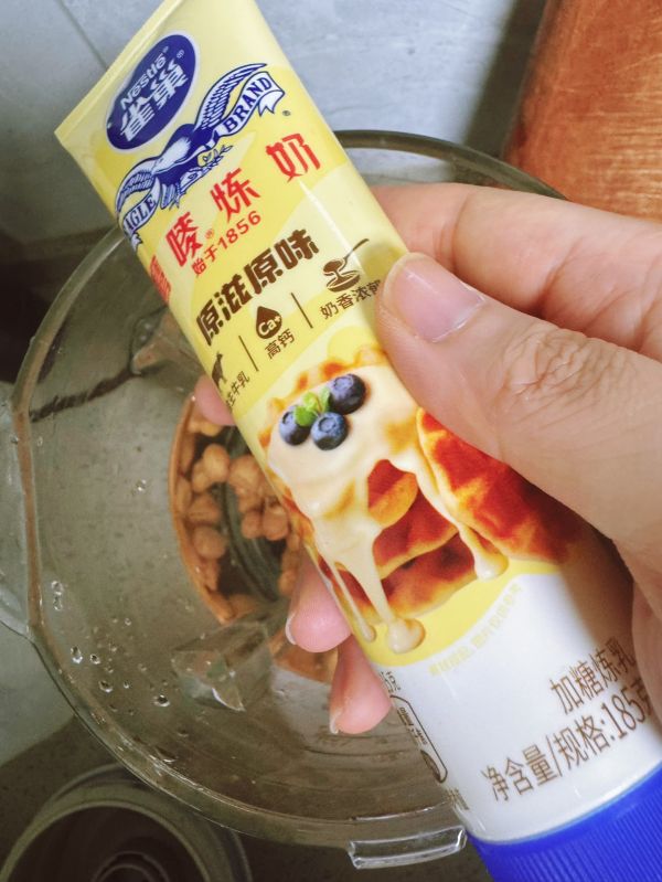 可以提前加雀巢炼奶,也可以在磨好后再加炼奶。