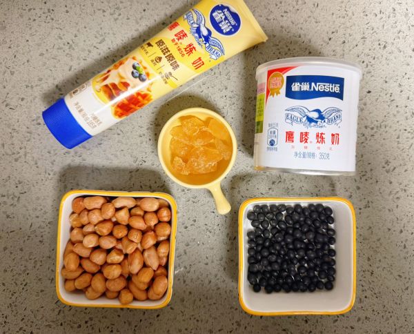 准备食材:黑豆35克、花生90克(喜欢花生浓一点就多放)黄冰糖20克、雀巢鹰唛炼奶20克(支装和罐装的味道是一样的哦)