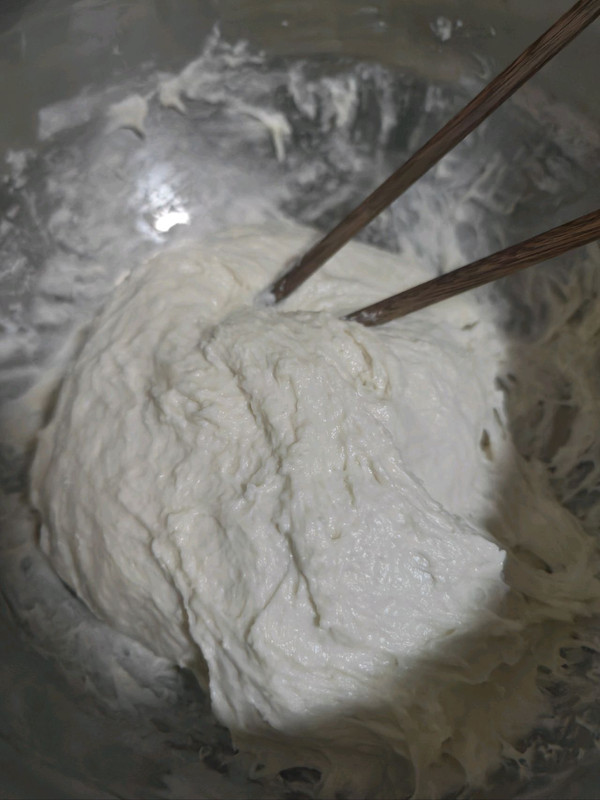 一斤面粉,200克水,半包酵母粉,搅拌均匀,面不要和的太硬,软一点,放在暖气旁边发30分钟,中间搅拌一下排气。