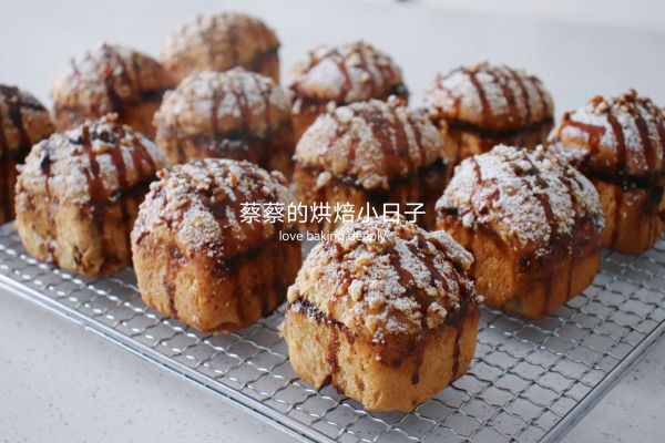 再挤在做好的面包表面上,撒上薄薄的一层防潮糖粉。