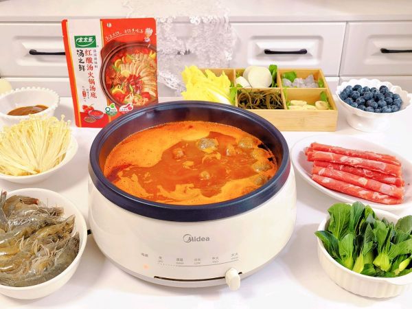 首先将太太乐红酸汤火锅汤底调味料倒入锅中,这款火锅汤底地道贵州风味,酸辣辛香,酸爽又开胃,红酸汤的发酵酸和番茄的天然酸融合的敲完美,双重酸爽,真材实料,安心之选