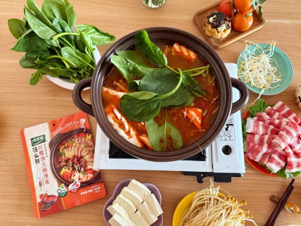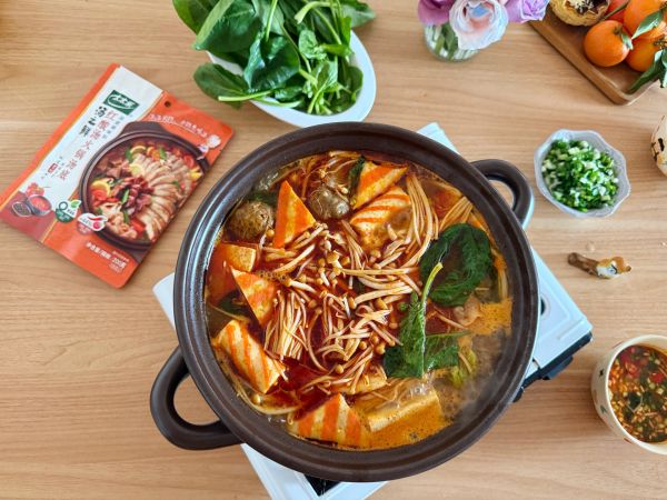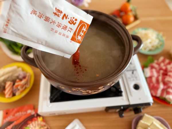 锅中加水烧热,取太太乐红酸汤火锅汤底料包入锅,番茄与辣椒的醇厚酸香,让汤底层次感瞬间提升!