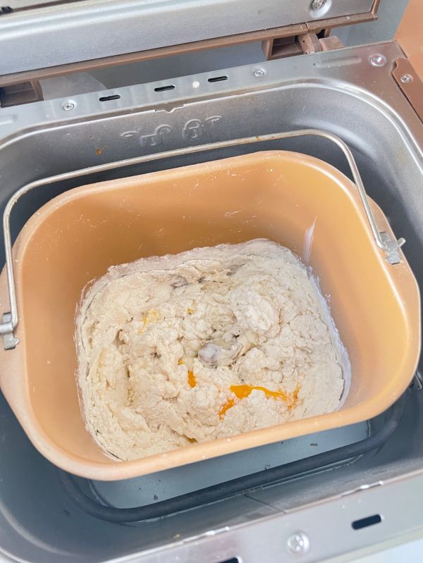 把前7种材料全部混合,放进面包机里选择和面模式10分钟。