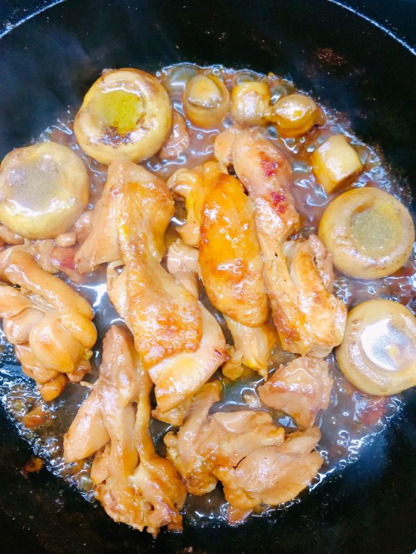 将鸡排和口蘑摆在上面,锅中的汁水淋在鸡排上面