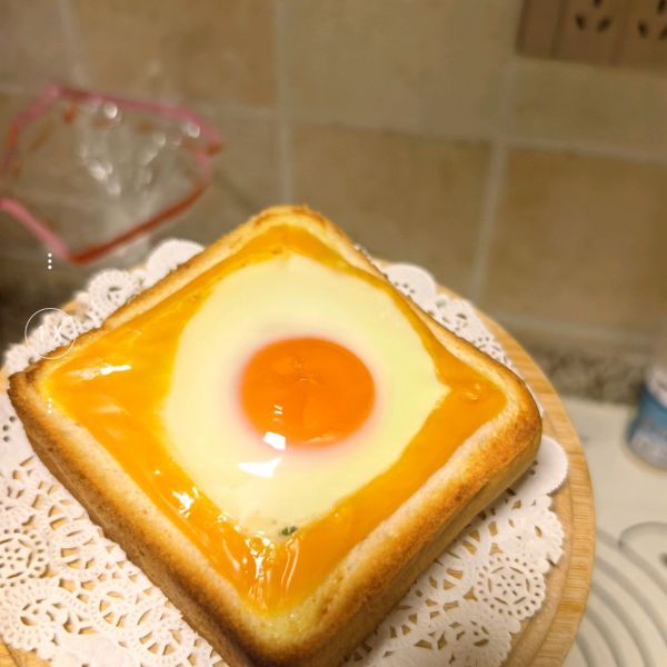 时间到后,吐司外酥里软,蛋黄微微溏心,香气扑鼻。