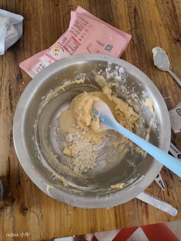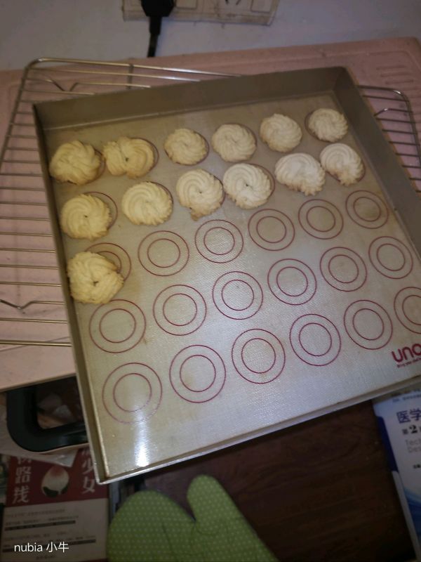 烤箱预热150度5分钟,时间到,放入曲奇烤25分钟。完成。