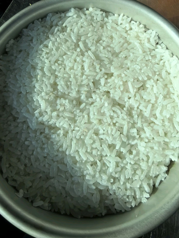 六寸的蛋糕模具刷上薄油或者铺保鲜膜,然后先铺一层米饭