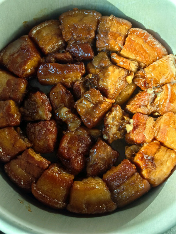 我脱模后放在盘子里了,然后上面再摆一层红烧肉,同样的,好看的摆周围,我的红烧肉炖的太烂了