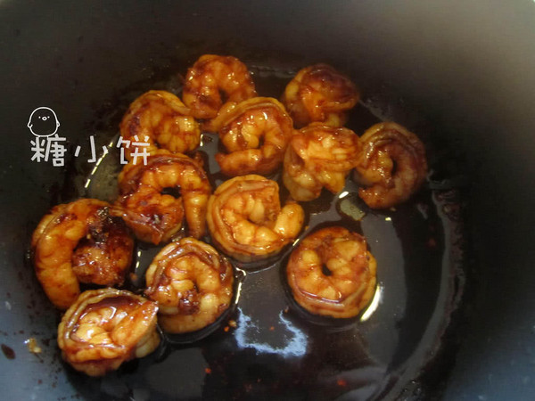 起油锅,放入腌好的虾仁翻炒,虾仁自然卷曲成虾球状 (这里我直接用了炒花生剩下来的油)