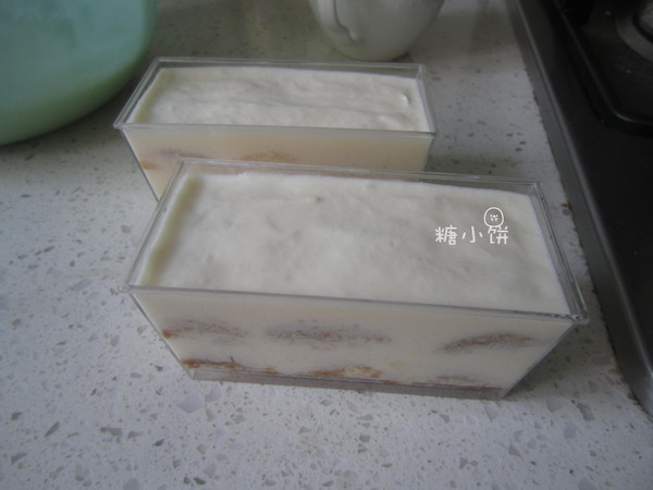 再铺一层刷过咖啡酒液的手指饼,再铺慕斯糊。如此反复 这个铺几层是根据自己的喜好以及容器的深度来决定的。只要最后一层是慕斯糊就可以了 将表面的慕斯糊稍稍抹平后送入冰箱冷藏至少两个小时,冷藏一夜更美味!
